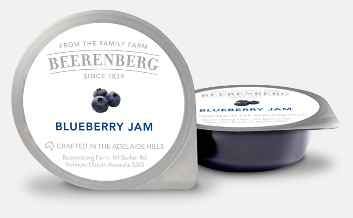 Single-serve blueberry jam from Beerenberg, crafted in the Adelaide Hills for a genuine fruit flavour. Supplied as 120 x 14 g single-serve portions, these sealed cups are ideal for cafes, hotels, catering and breakfast buffets. Made with real blueberries for a sweet-tart taste and a smooth, spoonable texture, they’re perfect for bread, toast, pastries or as a convenient topping for yogurt and desserts. Packaged for easy portion control and minimal waste, these jam cups simplify service while maintaining bakery-quality flavour. Category: Jams & Spreads. (Contains fruit, sugar and pectin.)