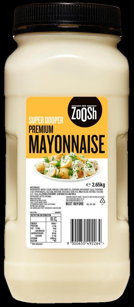 Rich, creamy and made for high-volume use, Zoosh Super Dooper Premium Mayonnaise comes in a 2.65kg foodservice container ideal for cafés, catering and commercial kitchens. This premium mayonnaise works as a versatile sauce and dressing — perfect for sandwiches, salads, dips, burger toppings and bulk recipe production. Labeled and formulated for convenience, the large tub reduces repackaging and simplifies back-of-house prep.
